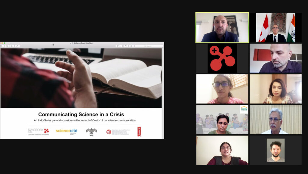 ‘The media plays a very important role in science communication, but in India what is not much talked about is the significant role played by Asha workers and Anganwadi workers who were at the grassroot level, convincing people about maintaining hygiene to social distancing to wearing masks. The media alone is not always sufficient, we need people at the ground level, whom communities trust to get information they need.’ added Dr. Shailesh Nayak, Director, National Institute of Advanced Studies (NIAS), Bangalore, also the Indian institutional partner for this global project with the swissnex network while jumping in to moderate the panel discussion.
